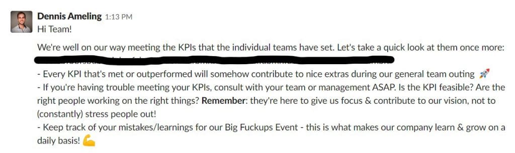 This aspect worries me the most. You’d be surprised by how many managers (and even CEOs) are using negative tone of voice in their messages. Telling people that they are “significantly below targets and still not working on weekends to catch up” is just plain wrong in my opinion, killing company culture and productivity (debates are coming up that say working too many hours significantly decreases productivity). Saying things like “people who rate ‘significantly below expectations’ will be fired without any negotiations” only makes matters worse. Just working longer doesn’t mean targets will actually be met. Instead, ask questions like “Is the KPI we set actually managable?”, “Did we put the right people together in this team, so they can flourish most?”, “Can we try things differently?”, etc.